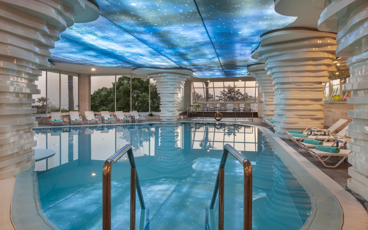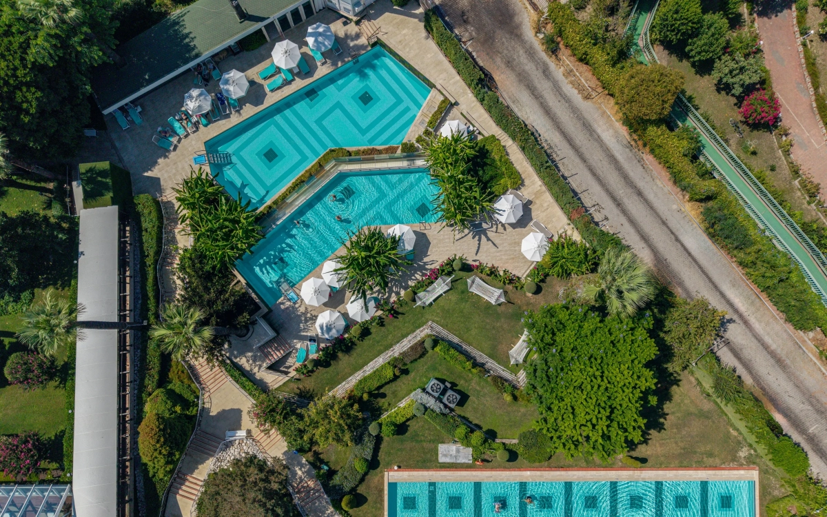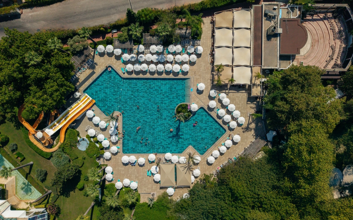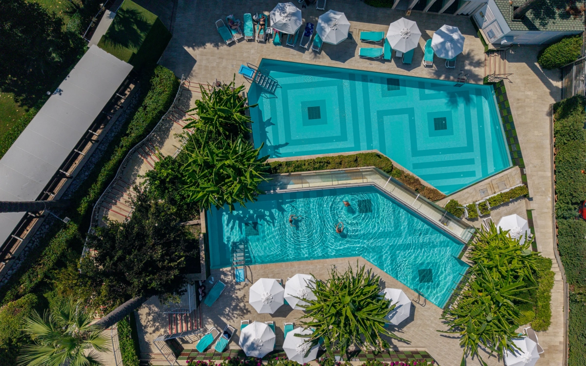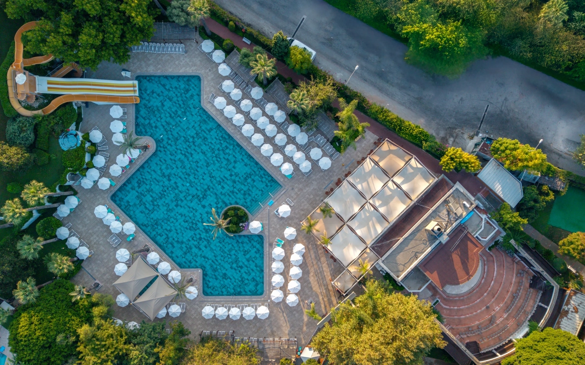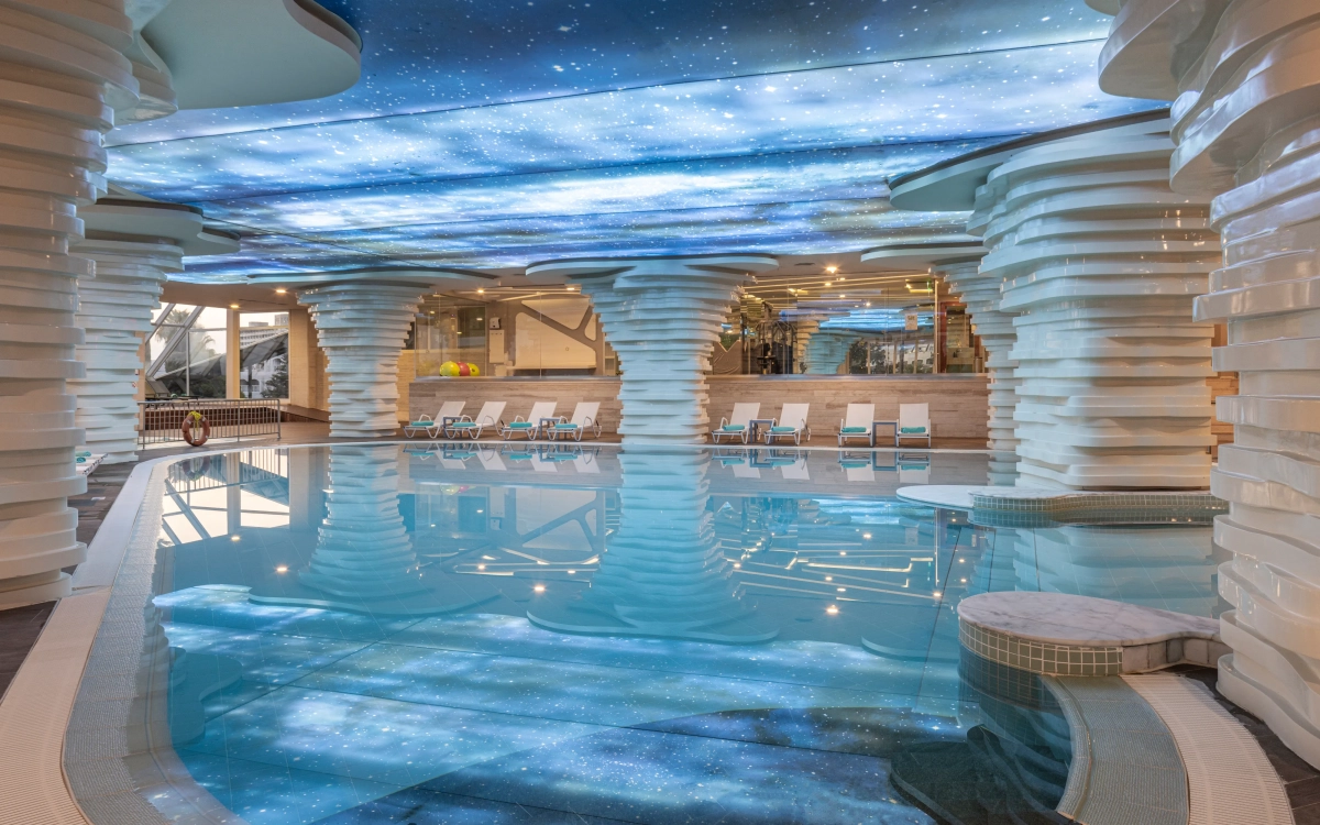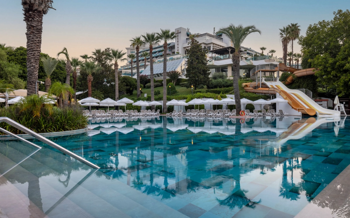 There are 4 in total, 3 outdoor and 1 indoor. There are 2 water slides in the outdoor pool and 2 seperate children’s pool next to it.